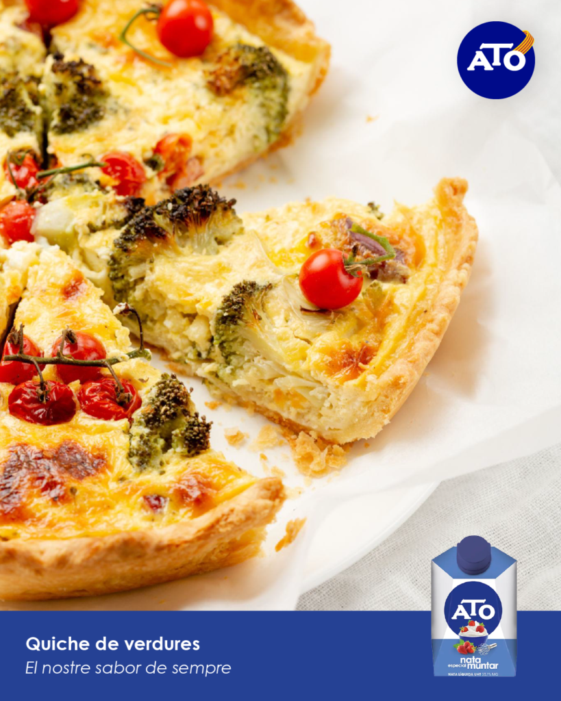 7. Aboca la mescla sobre la massa i enforna durant 30–35 minuts, fins que estigui quallada i lleugerament daurada per sobre.